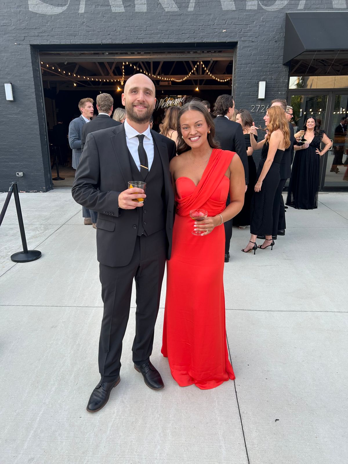 A stunning one-shoulder gown in crepe-back satin, featuring a draped georgette detail that gracefully wraps around the bodice for a glamorous silhouette.