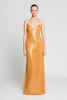 Amber sequin column gown with barely-there straps and allover shimmer—a radiant pick for festive nights out.