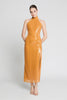A high-shine moment in sunburst sequins. This halter midi is cut from soft mesh with a smooth drape and glimmering finish. The open back and side slit keep things playful—just add heels and dance floor plans.