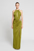 Glossy jersey gown with a gathered halter neckline and sculpted draping. Finished with a liquid metal floral brooch and side slit—made to turn heads.