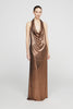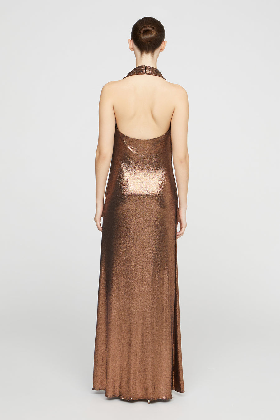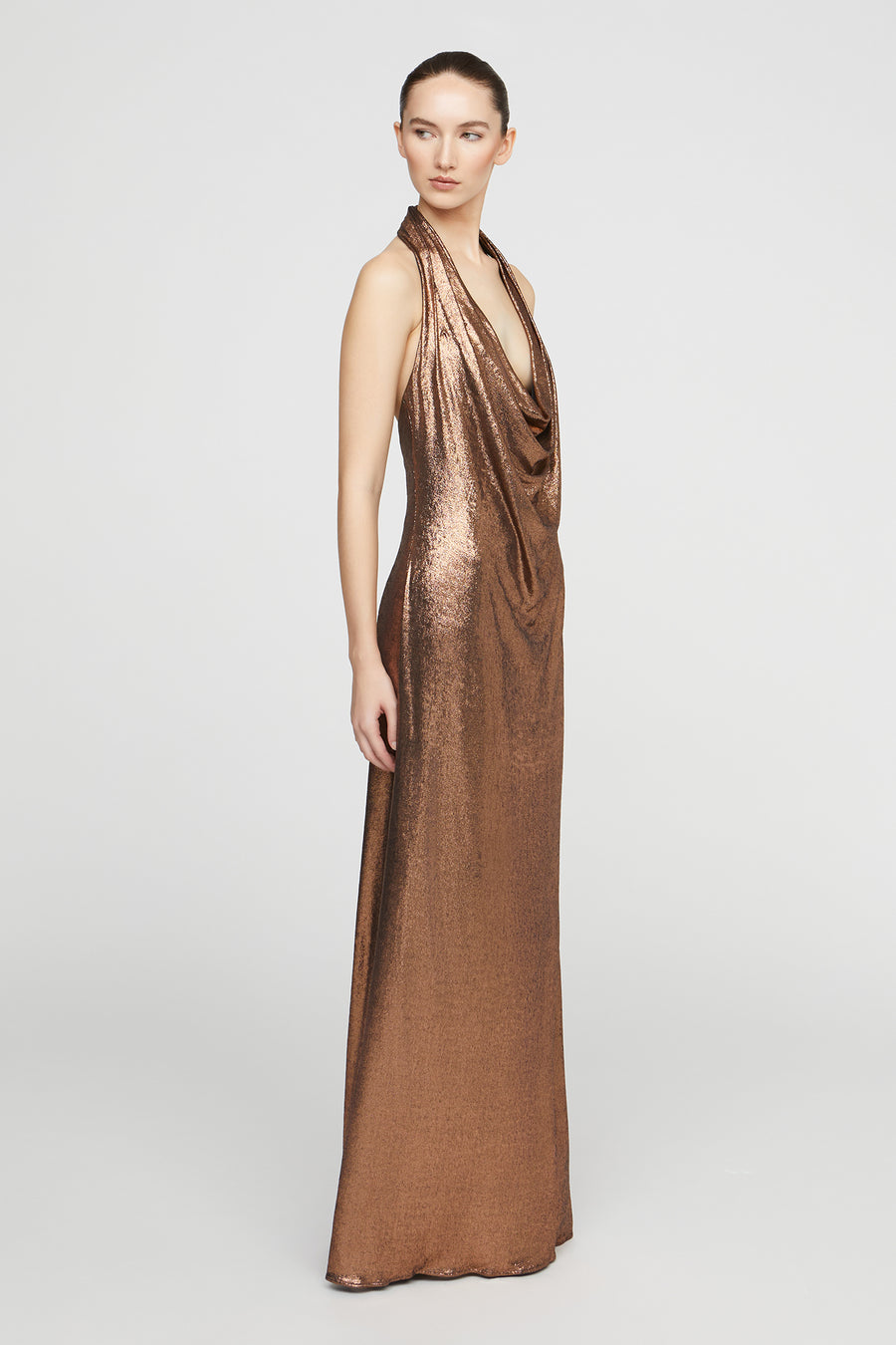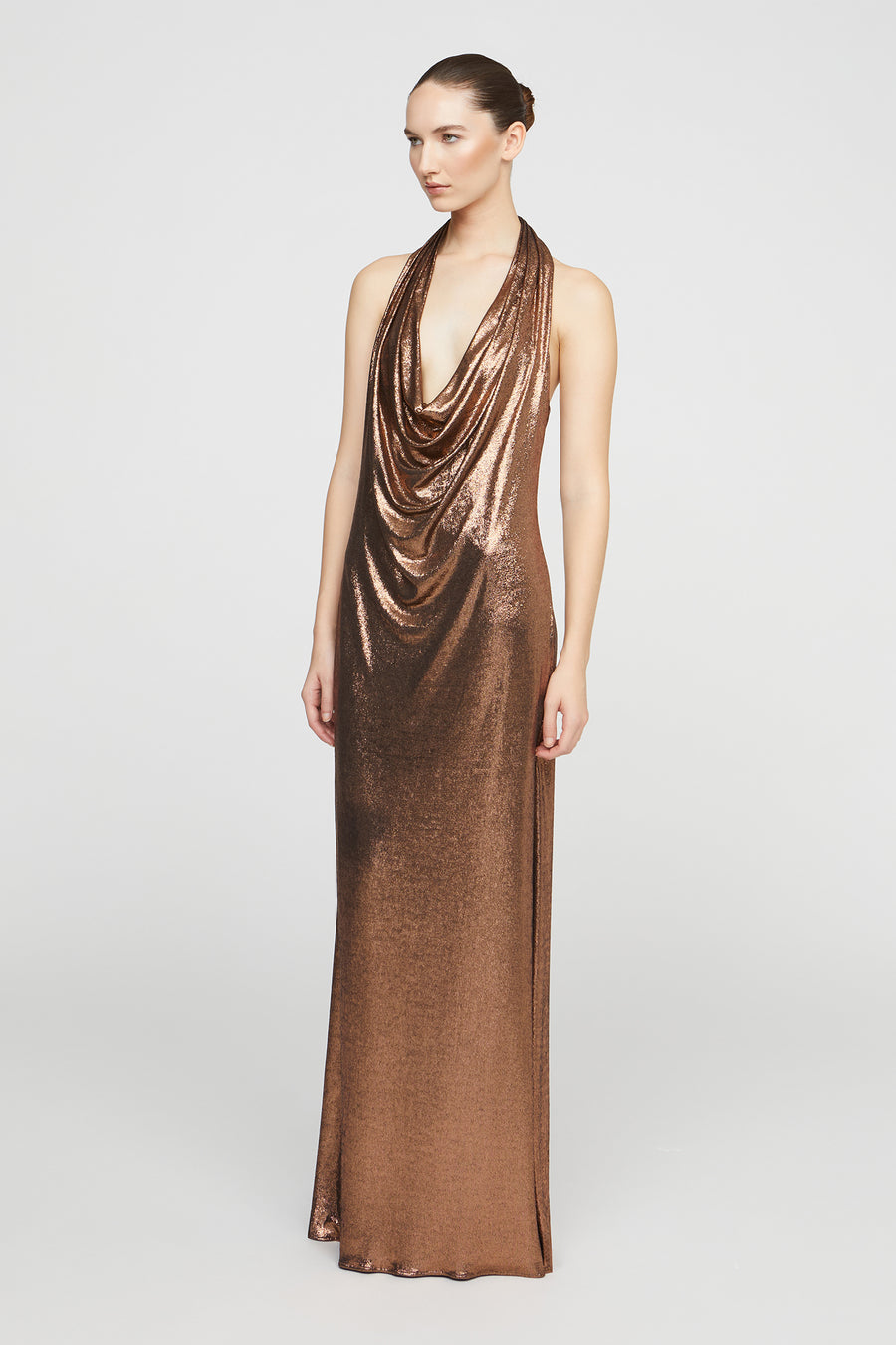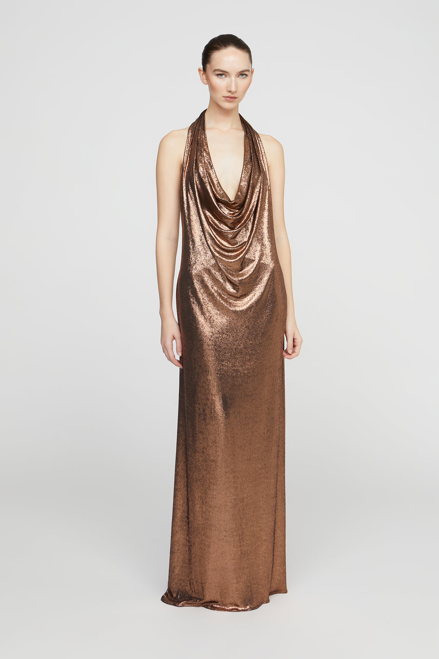 Designed in liquid-like metallic jersey, this gown features a draped cowl neckline, halter tie, and an open back that knows how to work a room. Perfect for gala nights, rooftop receptions, or anywhere the lights are low and the cameras flash.