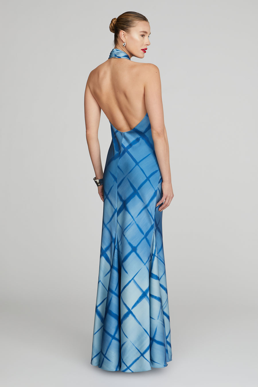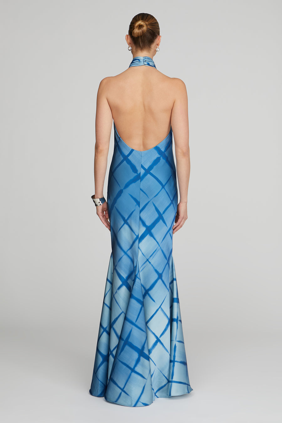 This halter-neck gown is cut in liquid satin with a vivid blue motif that feels right for warm nights and city light. The open back and subtle flare keep the silhouette sleek, with just enough movement to hold the room.